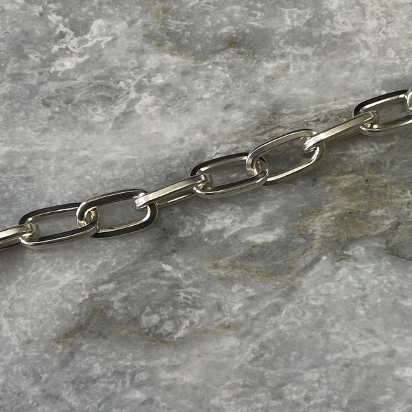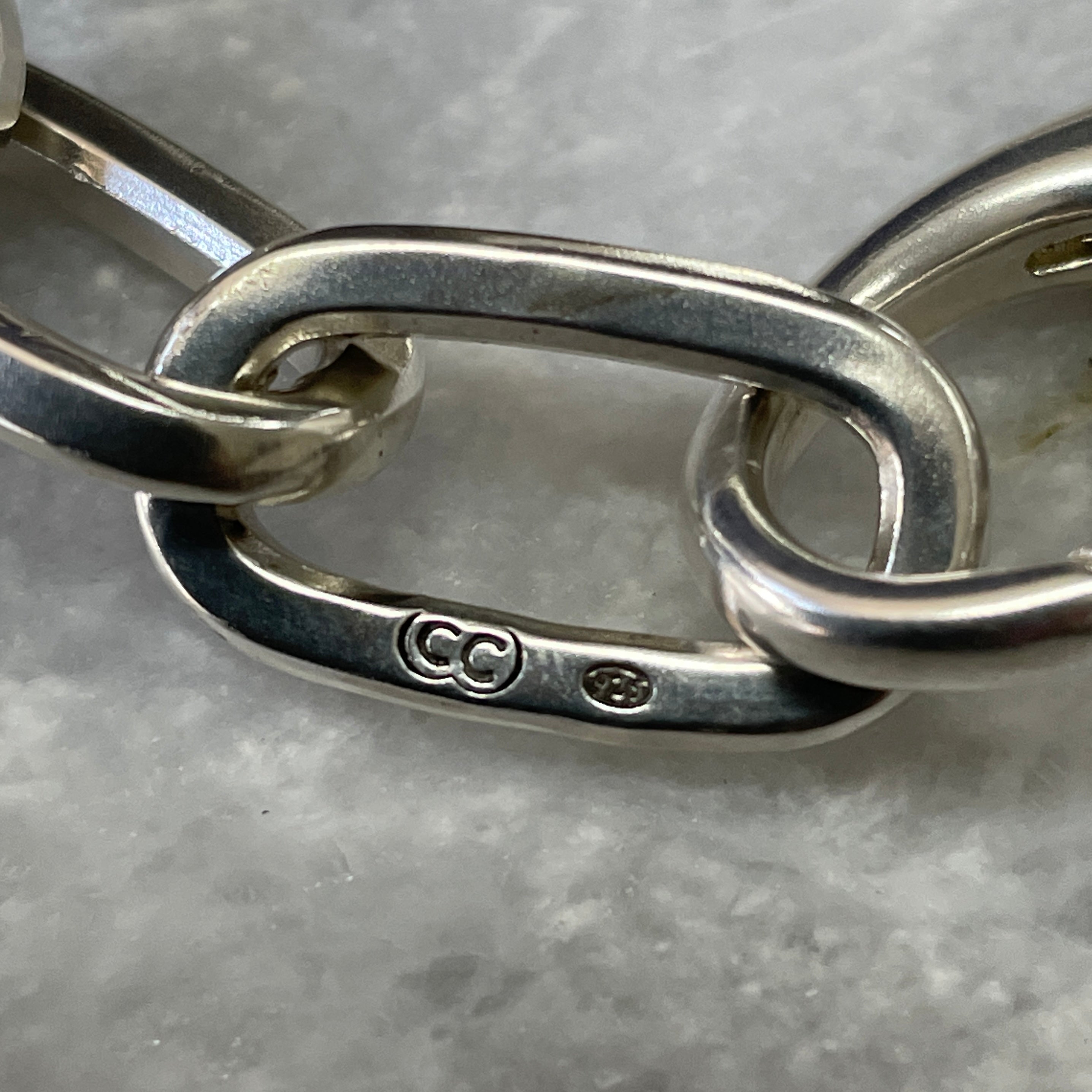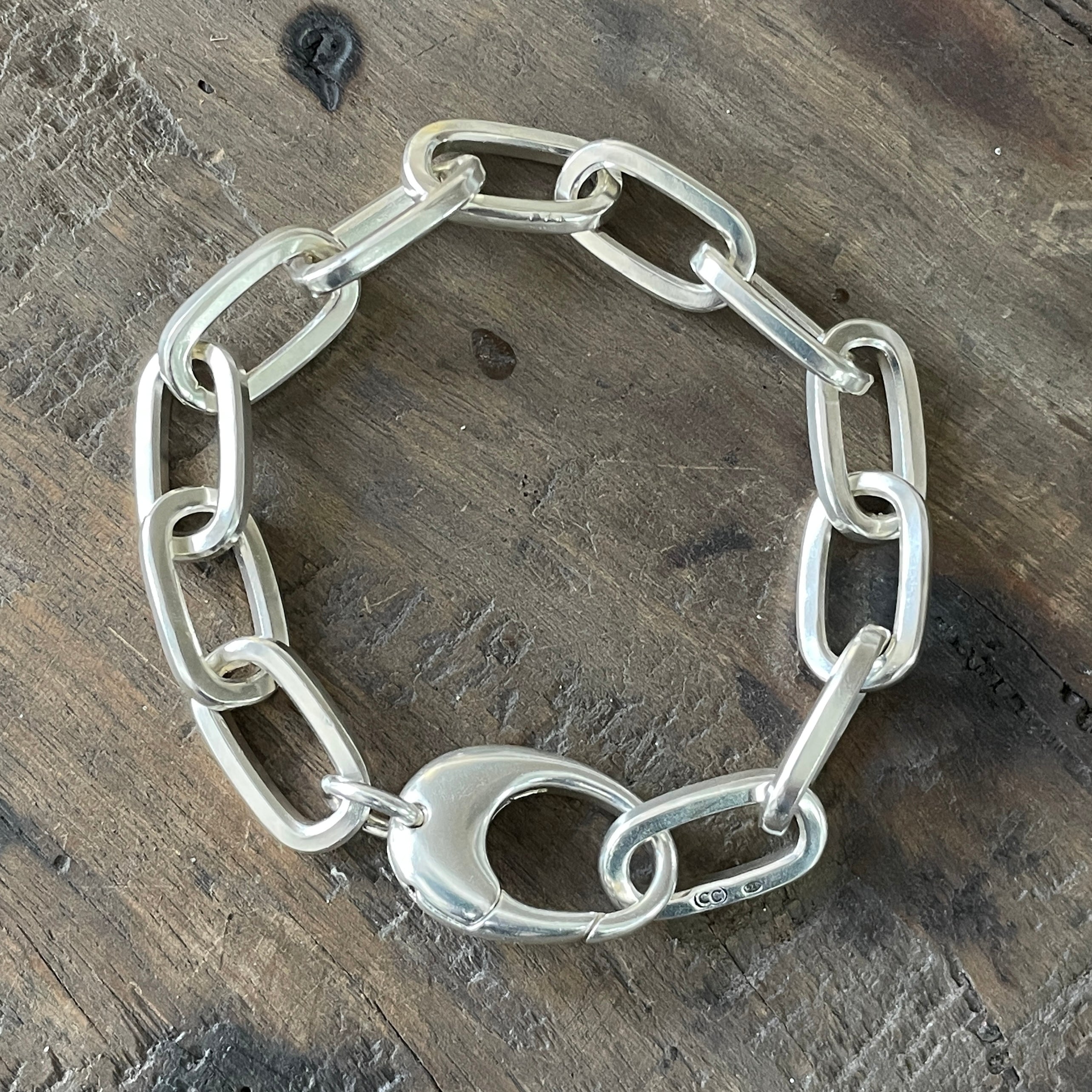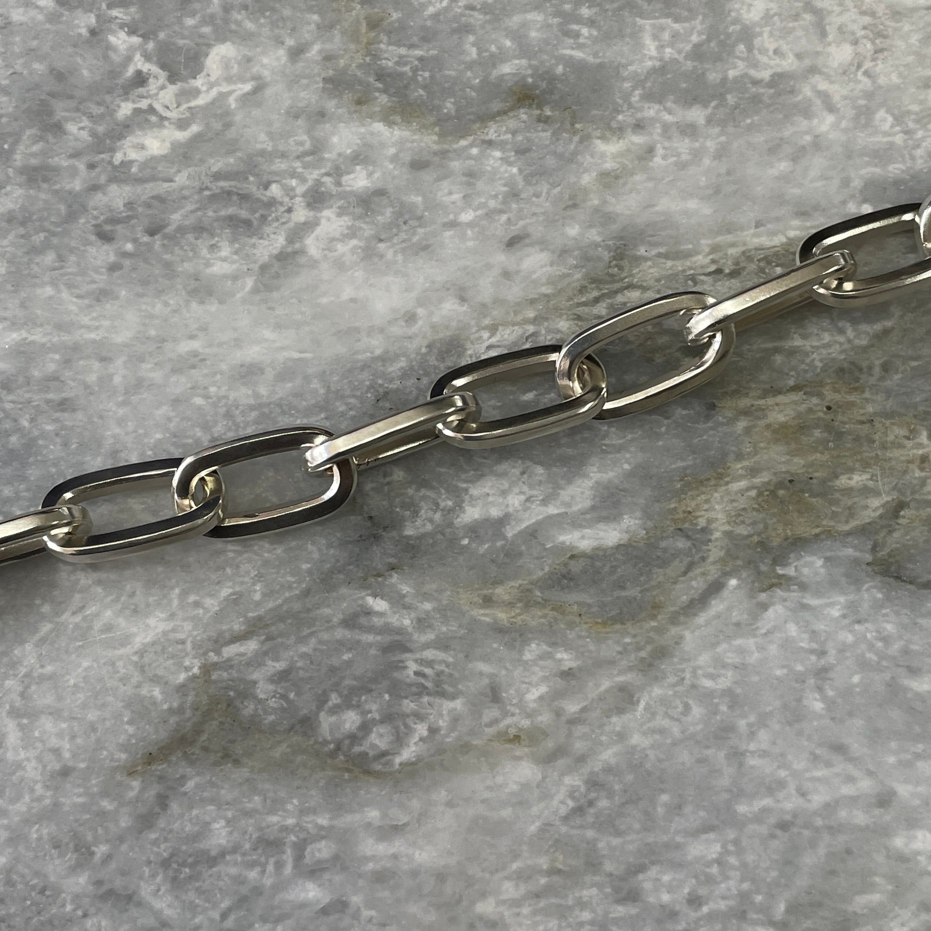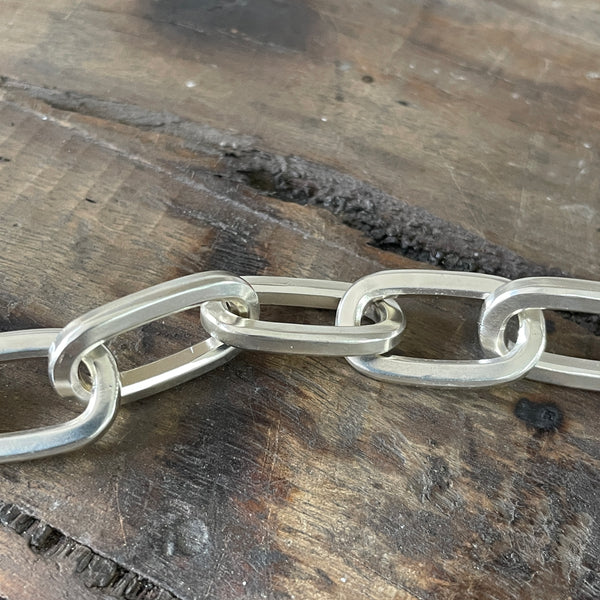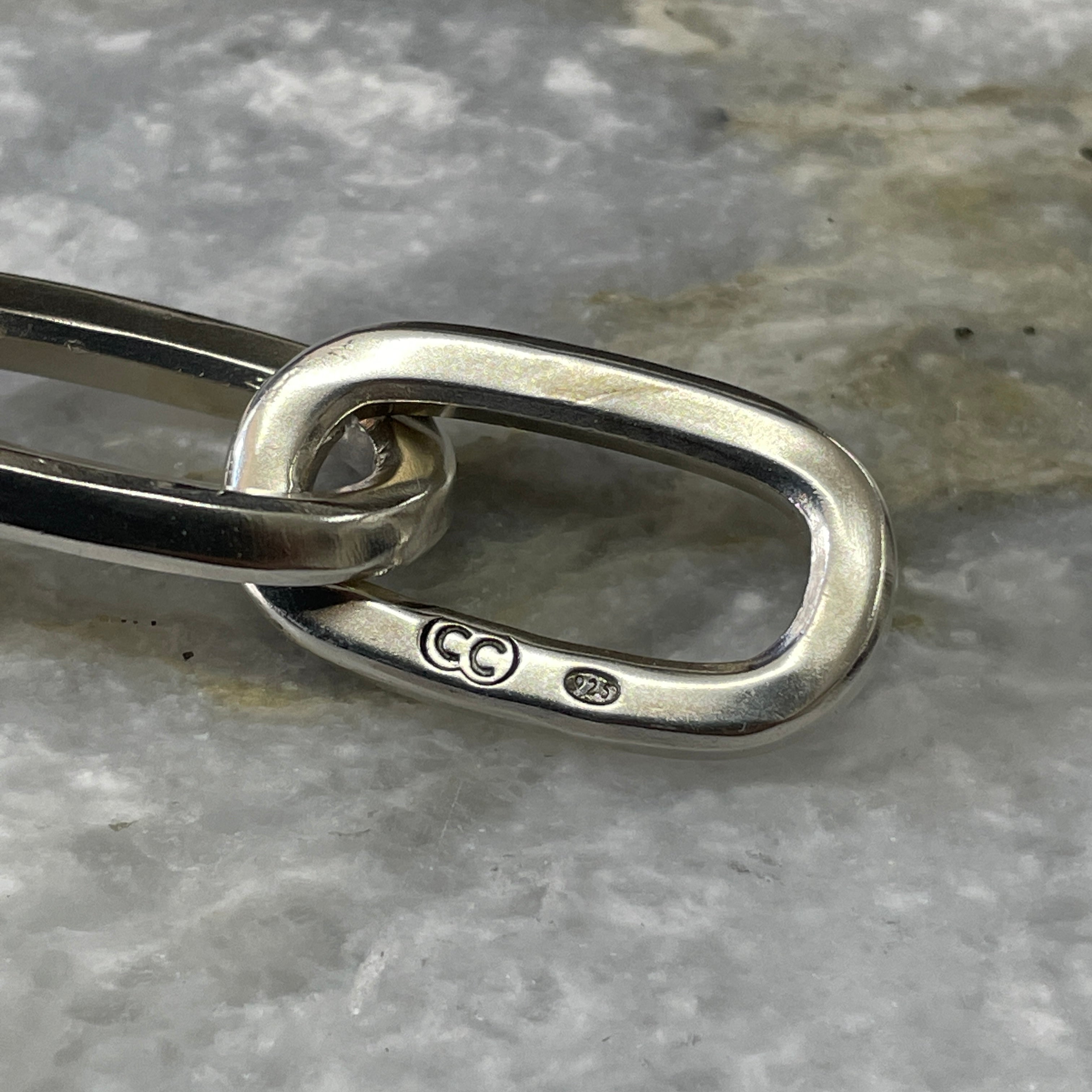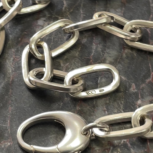 These beautifully chunky handmade chains are hand-stamped with our Custom Creed makers mark and a 925 sterling silver hallmark and completed with a heavy-duty sterling silver Caribiner-style clasp.. Perfectly imperfect; no two chains are ever exactly the same..